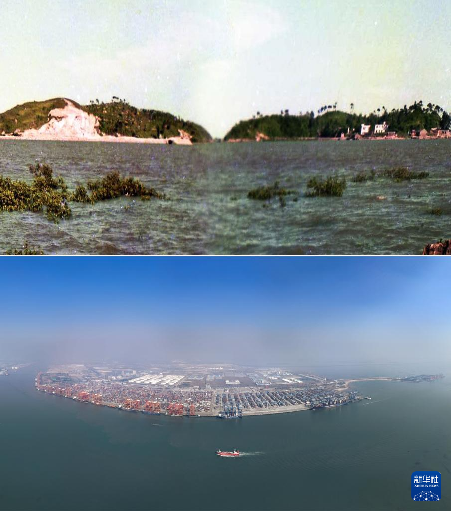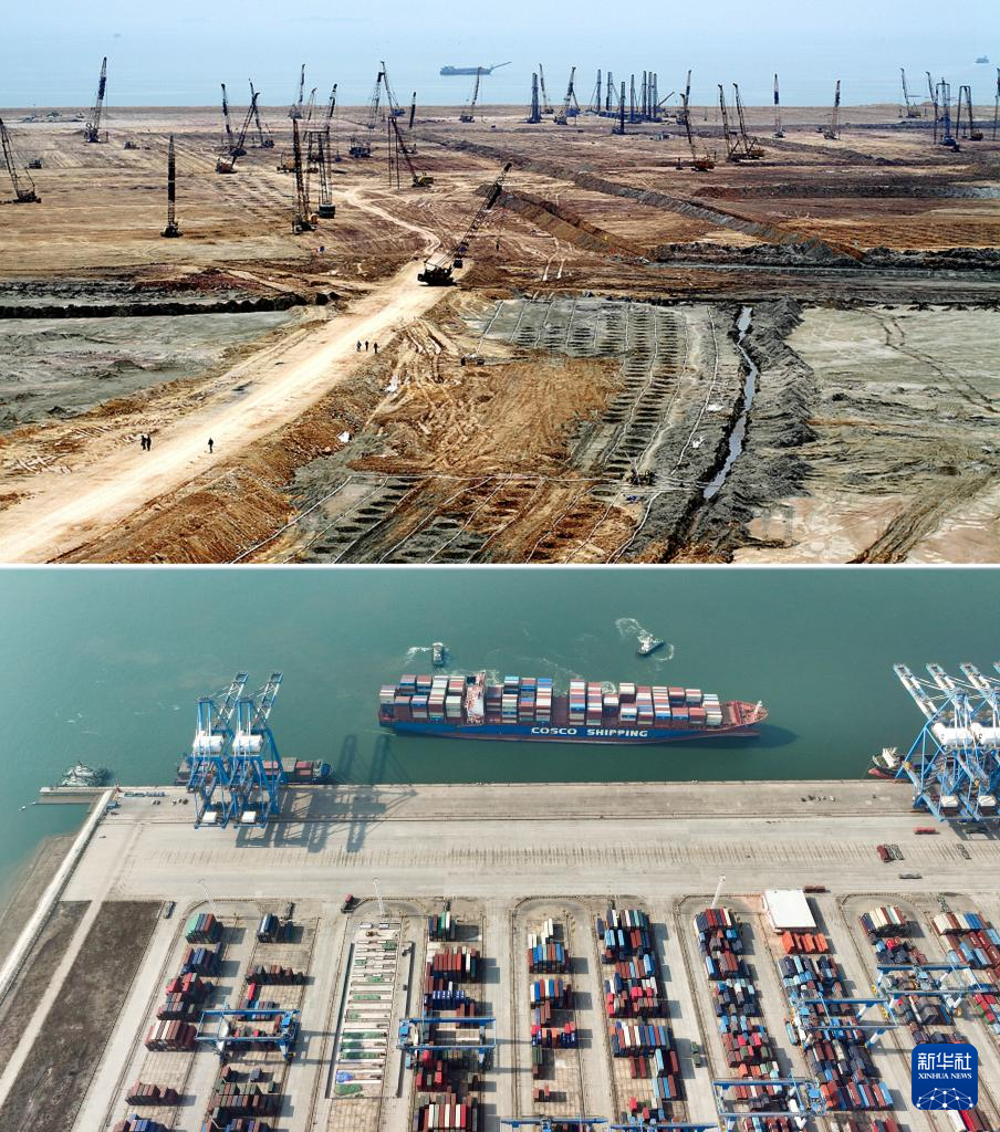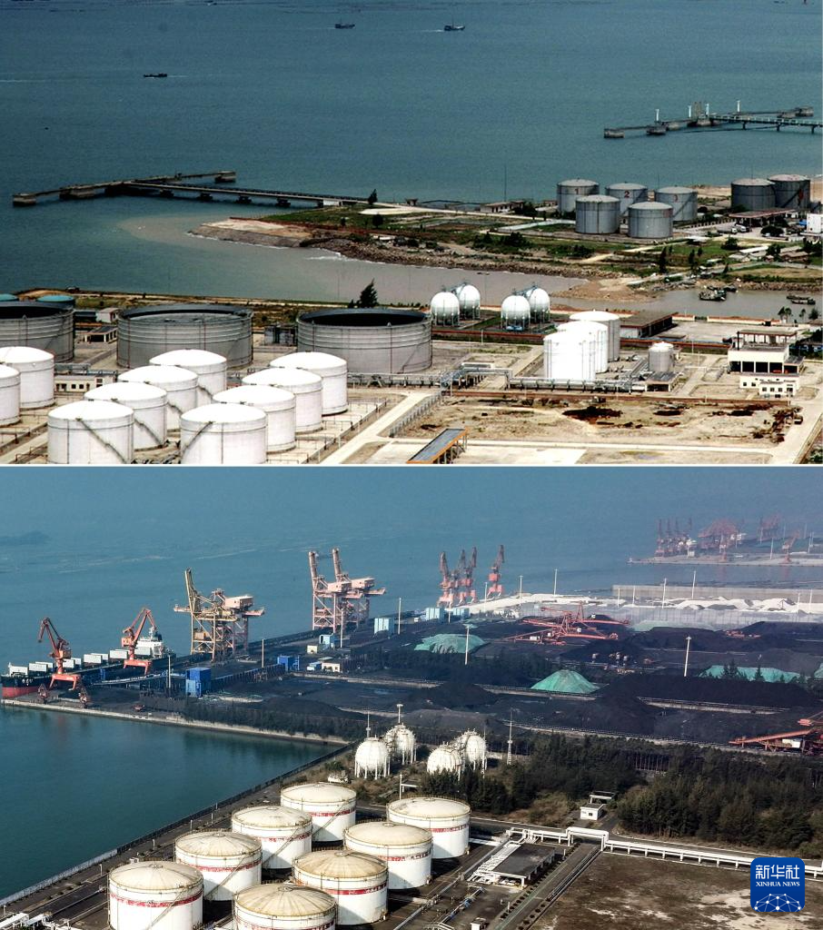 拼版照片:上图为2006年5月26日拍摄的钦州港能源码头建设初期的场景(新华社记者张爱林摄);下图为2024年12月31日拍摄的钦州港能源码头(无人机照片,新华社记者吕帅摄)。