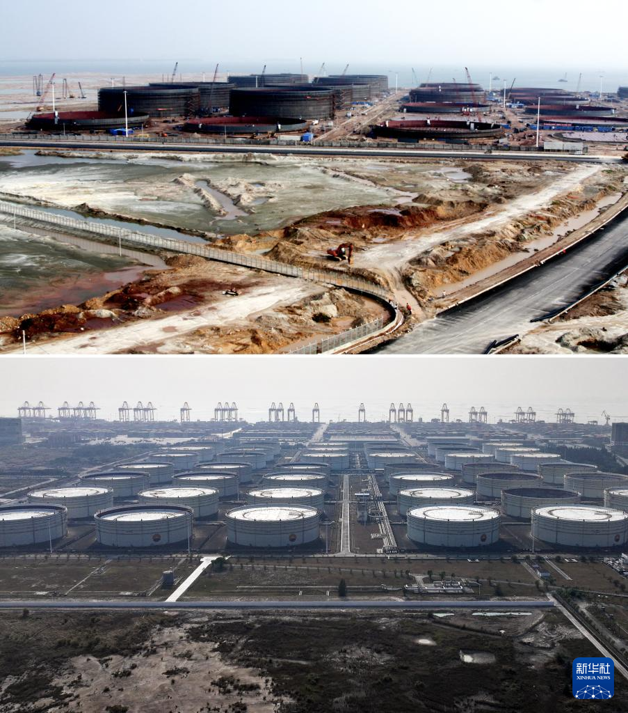 拼版照片:上图为2009年10月15日,施工队伍建设钦州港石化物流园(新华社记者张爱林摄);下图为2024年12月31日拍摄的钦州港石化物流园(无人机照片,新华社记者吕帅摄)。