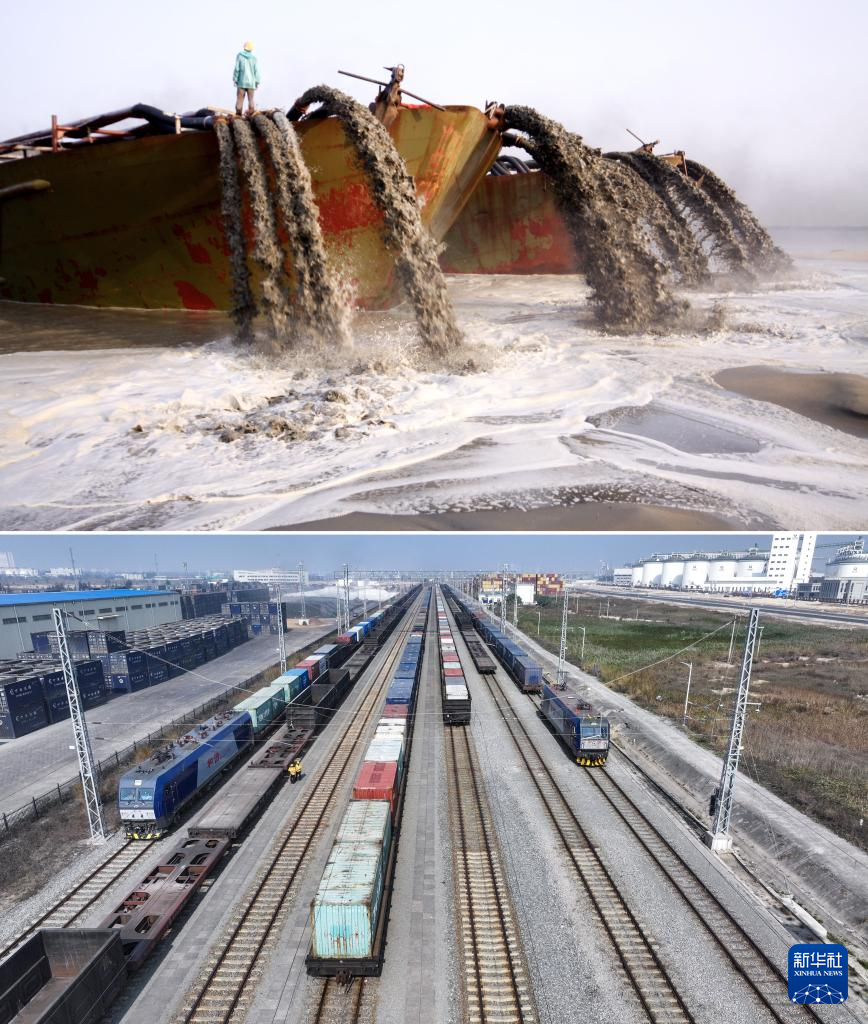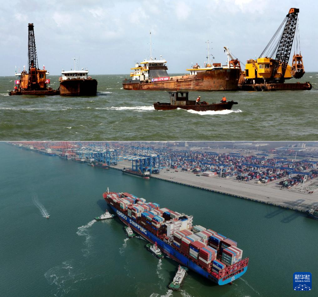 拼版照片:上图为2010年7月30日,施工队在钦州港疏浚航道(新华社记者张爱林摄);下图为2024年12月31日,一艘海轮在钦州港集装箱自动化码头泊岸(无人机照片,新华社记者吕帅摄)。