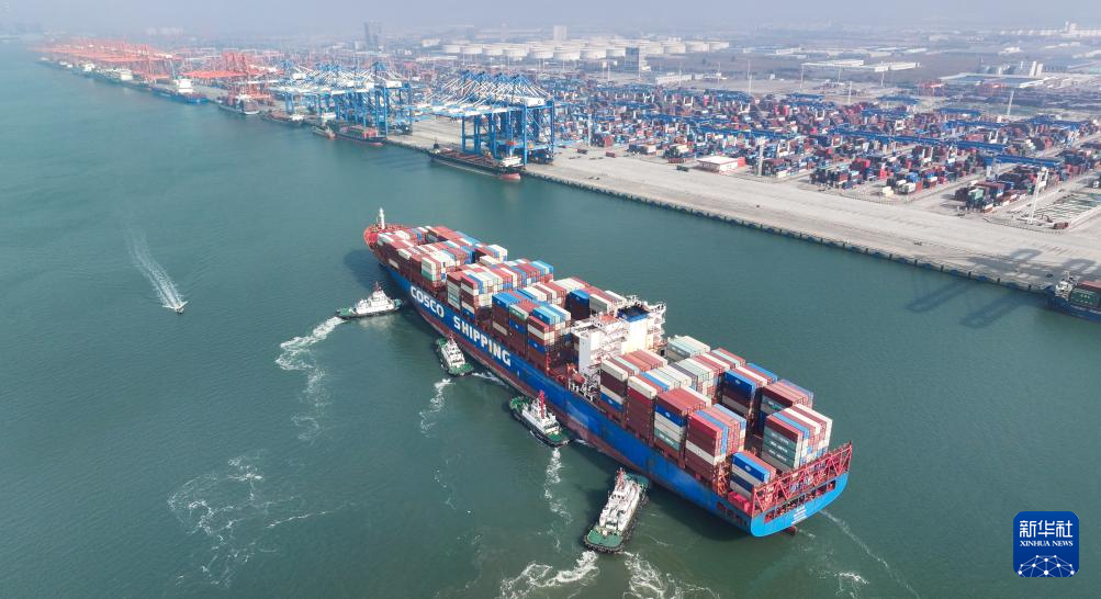 2024年12月31日,在钦州港集装箱自动化码头,四艘海事船帮助满载集装箱的海轮靠岸(无人机照片)。