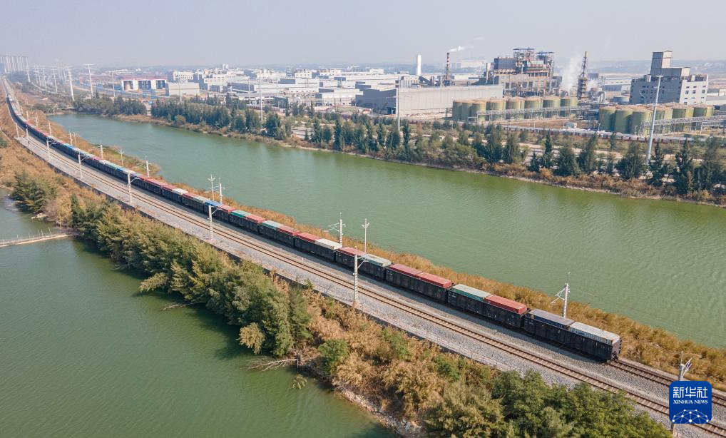 2024年12月31日,一列装载集装箱的铁海联运班列离开钦州港东站(无人机照片)。