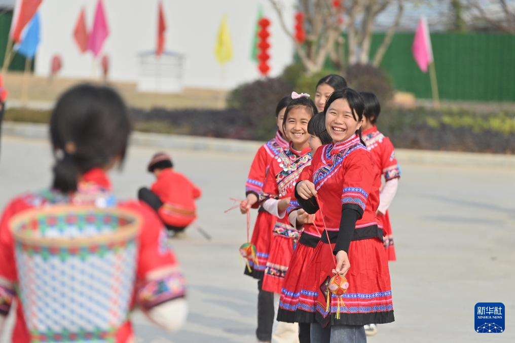 2月20日,在梧州市长洲区倒水镇富万村金桂广场,富万小学的学生参加抛绣球比赛。