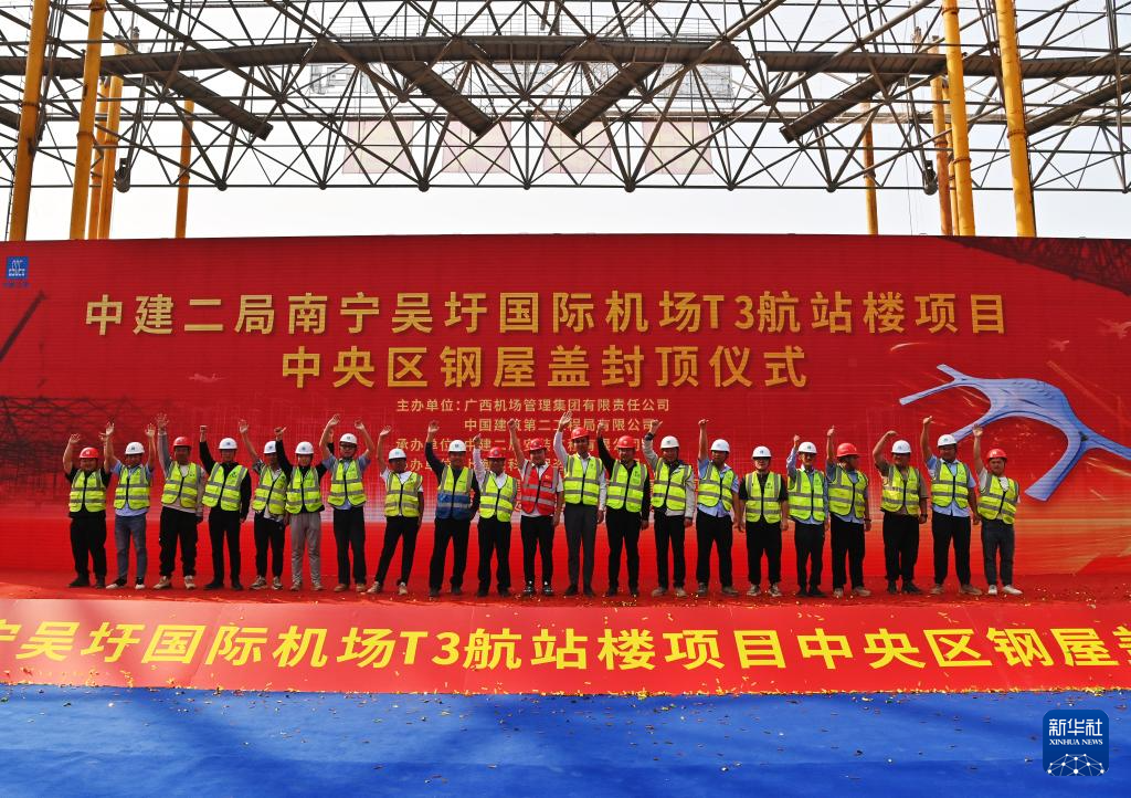 这是4月2日拍摄的南宁吴圩国际机场T3航站楼中央区钢结构主体封顶仪式现场。