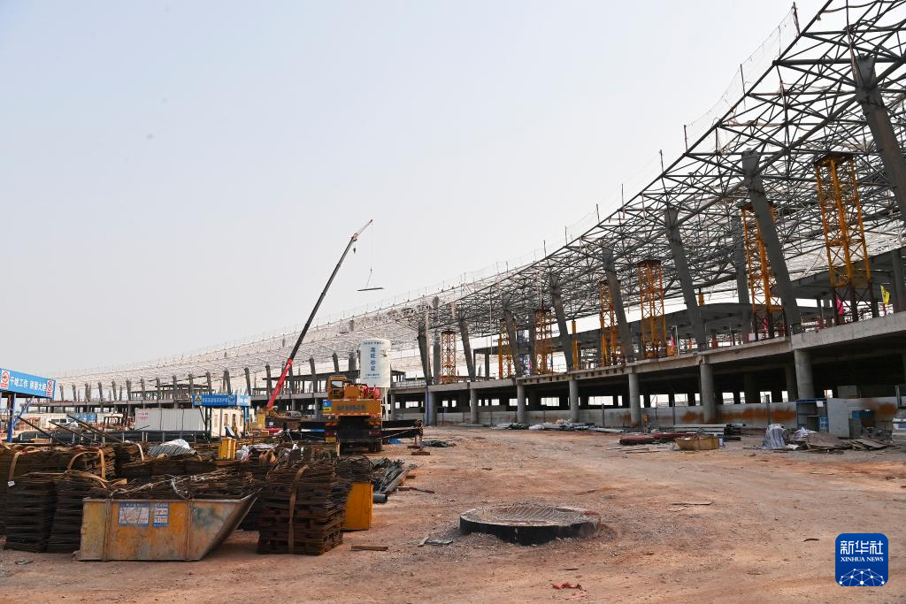 4月2日,工程车辆在南宁吴圩国际机场T3航站楼中央区钢结构屋盖施工现场吊装建材。