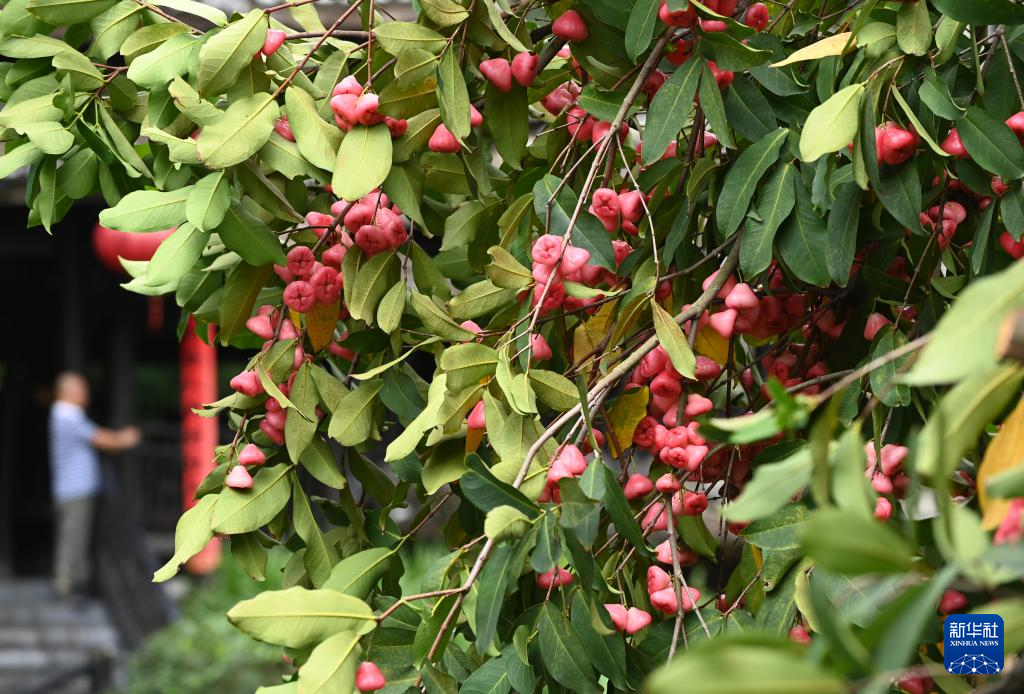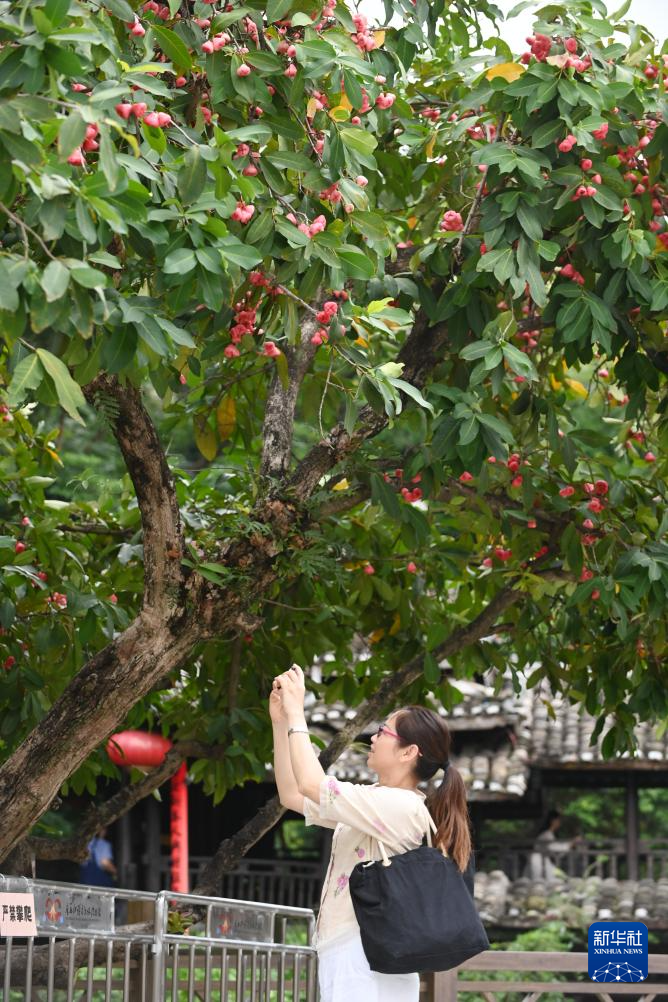 6月29日,在广西南宁市古城路,市民在拍摄一棵结果的莲雾树。