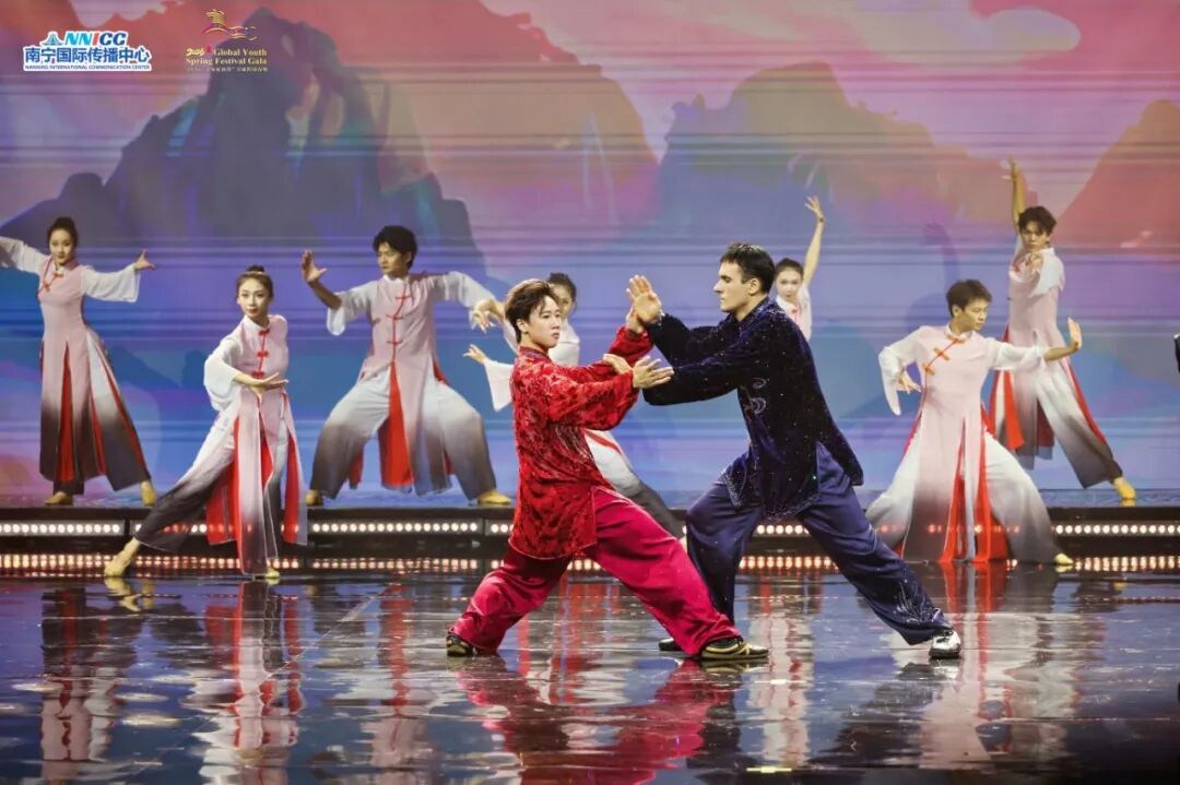 中国与巴西武术爱好者同台演绎武术《太极》,AI山水背景随拳势流转,诠释“和而不同”的跨国对话。
