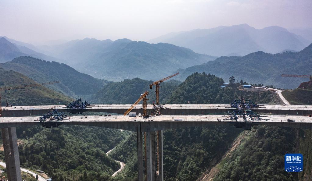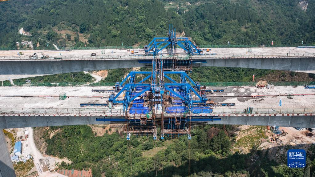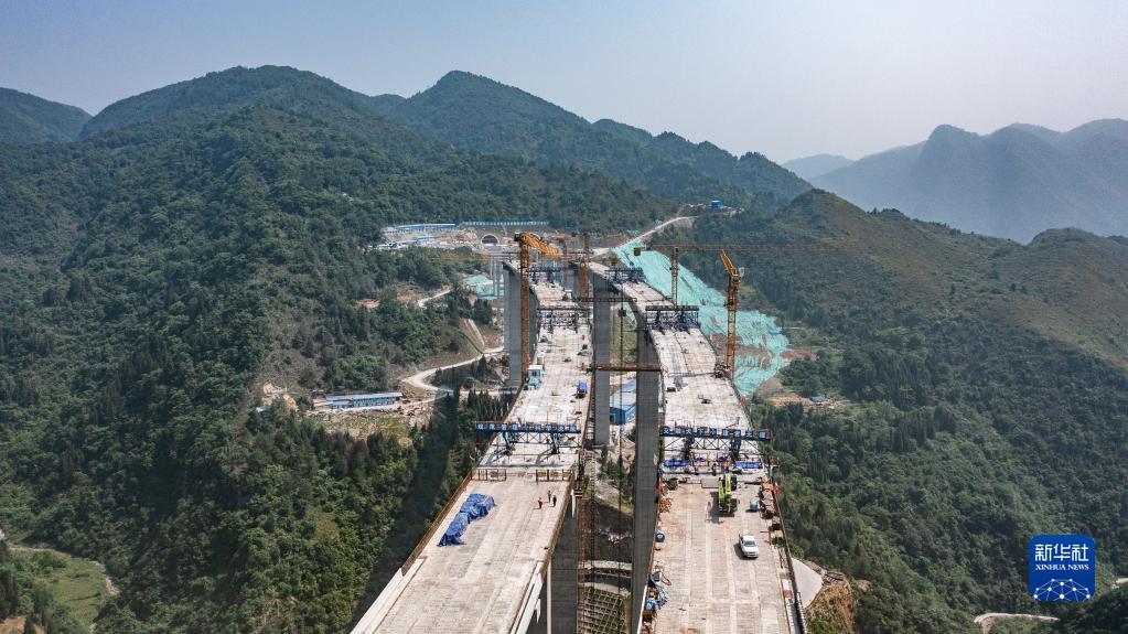 5月27日拍摄的贵金古高速清池特大桥主桥连续刚构合龙现场(无人机照片)。新华社记者 陶亮 摄