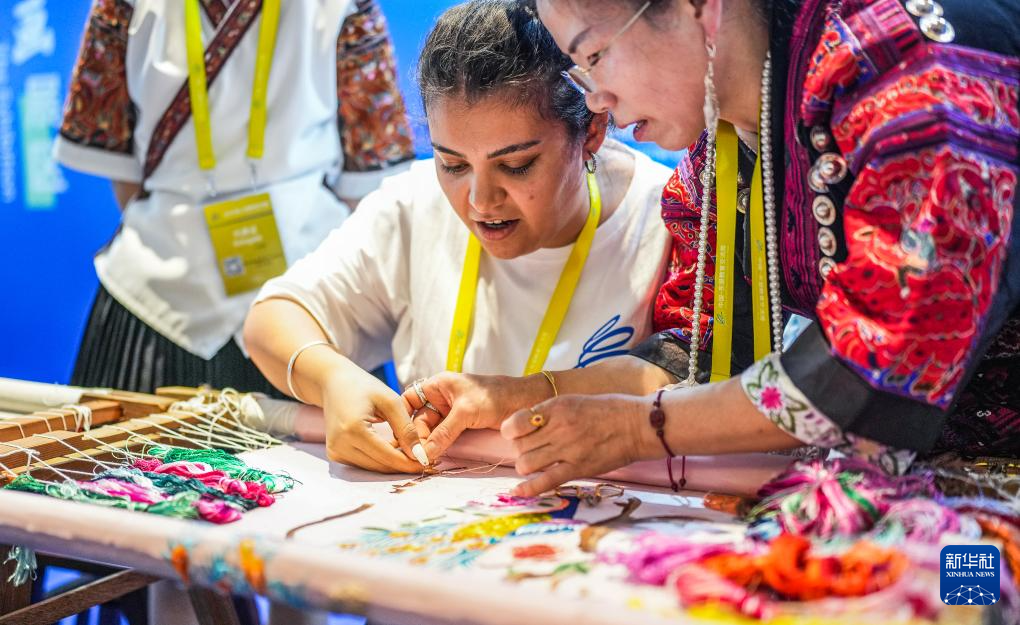 8月21日,留学生体验苗族手工刺绣制作。