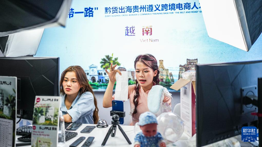 8月21日,留学生在跨境电商展区直播带货。