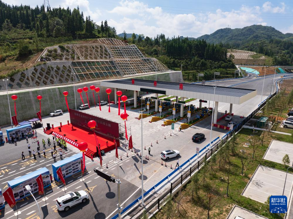 9月13日,车辆在桐梓南站外等待进入金仁桐高速(无人机照片)。