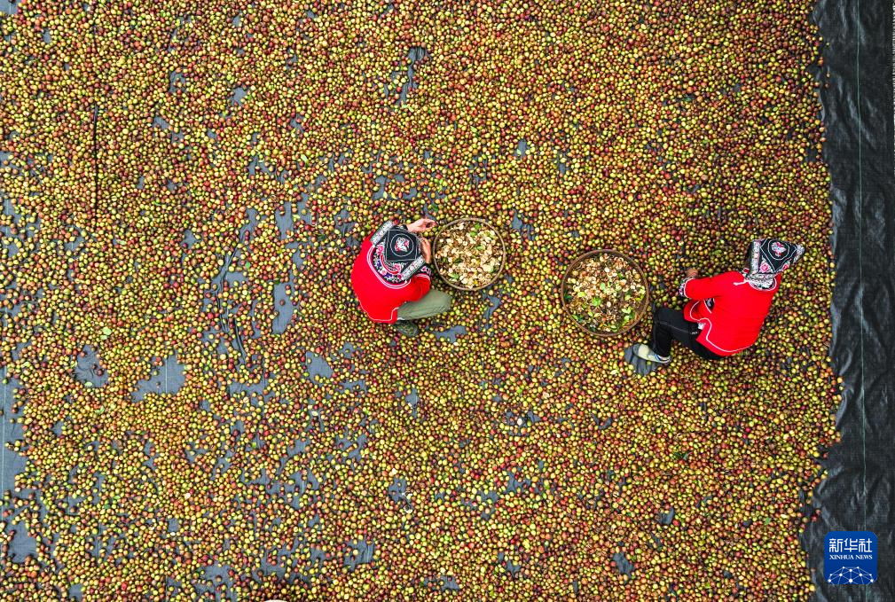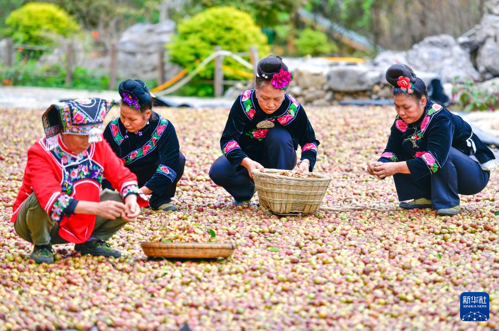 10月15日,村民在龙里县颐光山林油茶生态园晾晒油茶果。