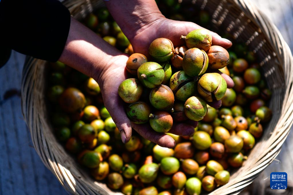 10月15日,村民在龙里县颐光山林油茶生态园展示新采摘的油茶果。