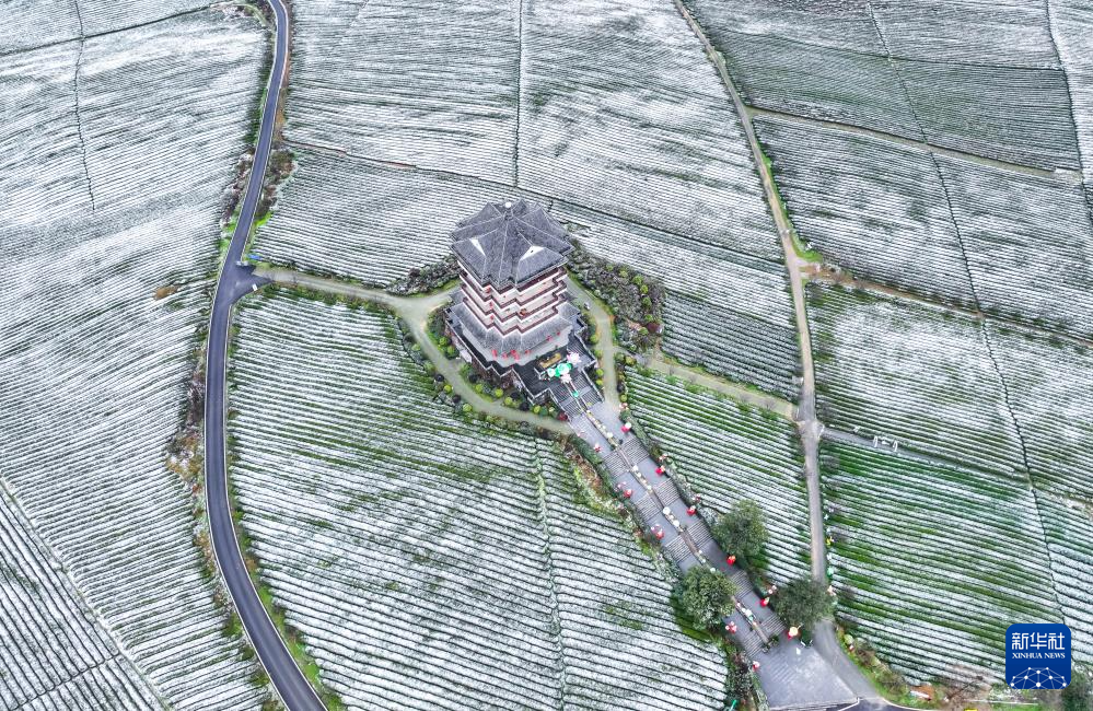 这是雪后的遵义市湄潭茶海景区(2025年1月9日摄,无人机照片)。