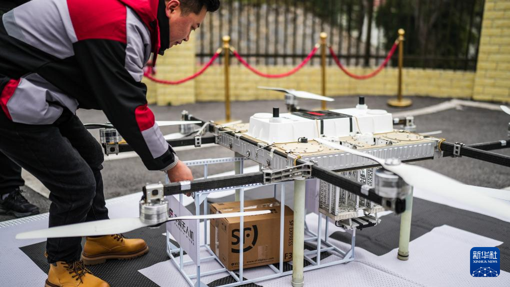 1月15日,在贵州省修文县,工作人员将货物装入无人机配送篮。