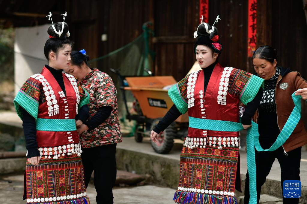 在贵州省凯里市舟溪镇舟溪村茶林苗寨,长辈在帮助双胞胎姐妹杨柠羽(左一)、杨柠竹(左三)穿戴苗族盛装(2月15日摄)。
