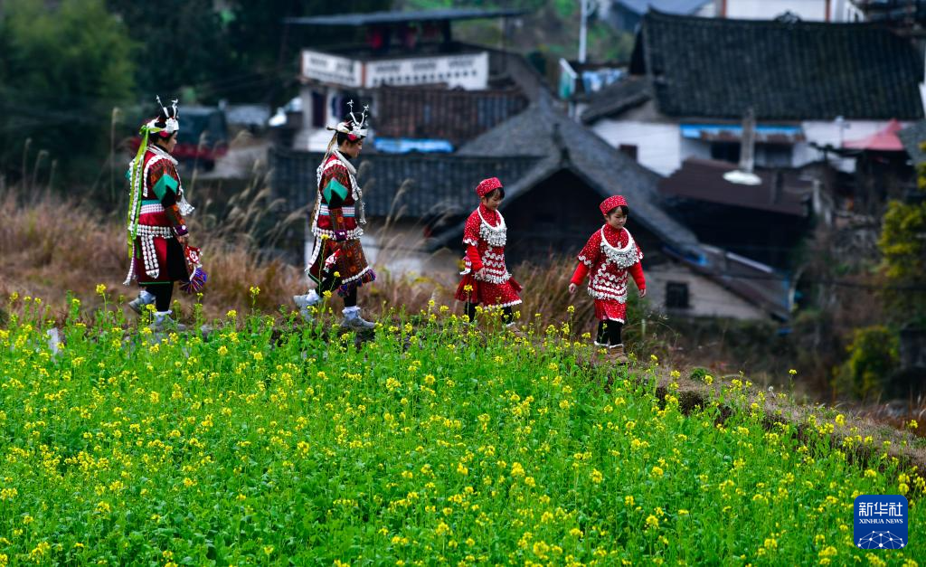 在贵州省凯里市舟溪镇舟溪村茶林苗寨,两对苗族双胞胎姐妹前往“甘囊香”芦笙堂参加芦笙节活动(2月15日摄)。