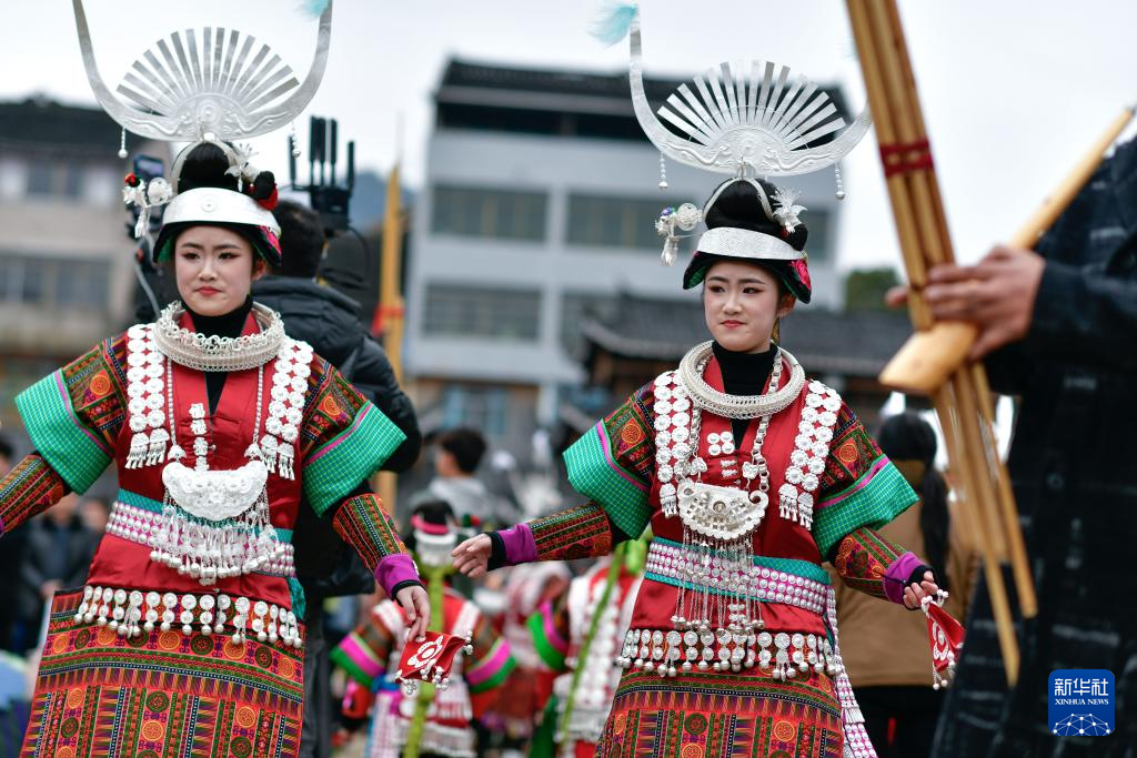 在贵州省凯里市舟溪镇“甘囊香”芦笙堂,苗族双胞胎姐妹杨柠竹(左)、杨柠羽在跳芦笙舞(2月15日摄)。