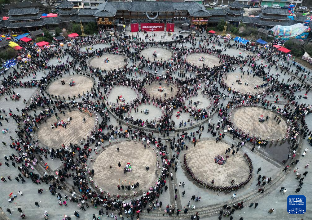 这是2月16日拍摄的贵州省凯里市舟溪镇“甘囊香”芦笙节活动现场(无人机照片)。
