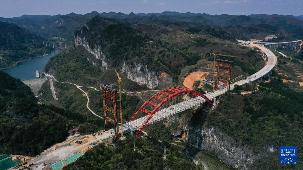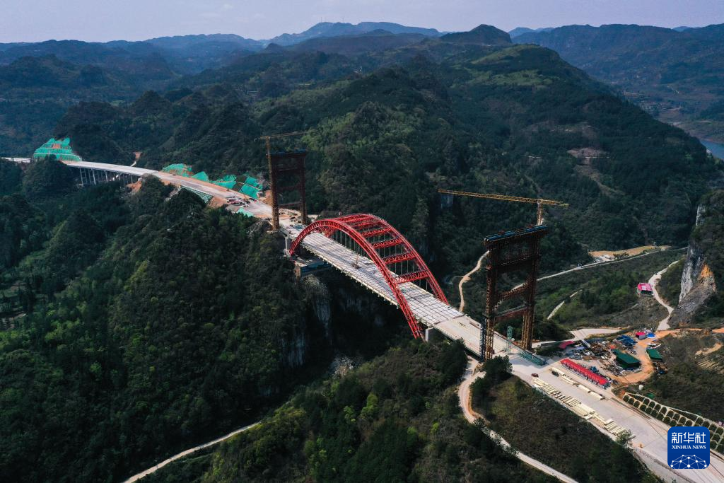 这是4月1日拍摄的贵阳至平塘高速公路马场河特大桥施工现场(无人机照片)。