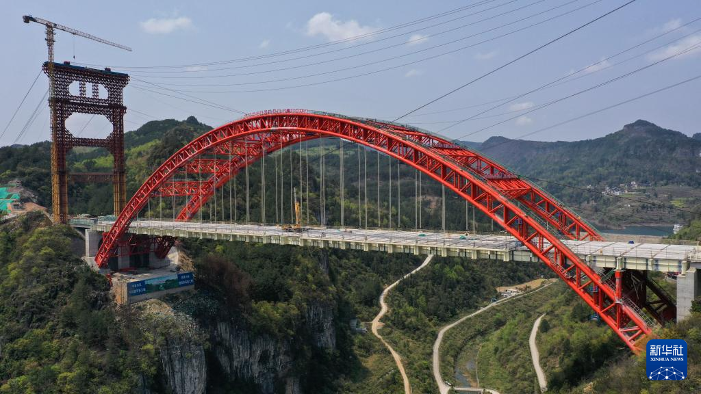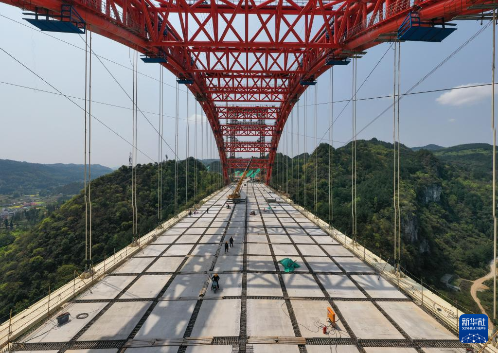 4月1日,工人在贵阳至平塘高速公路马场河特大桥上安装最后一块桥面板。