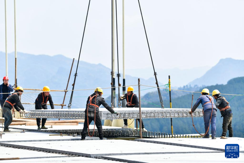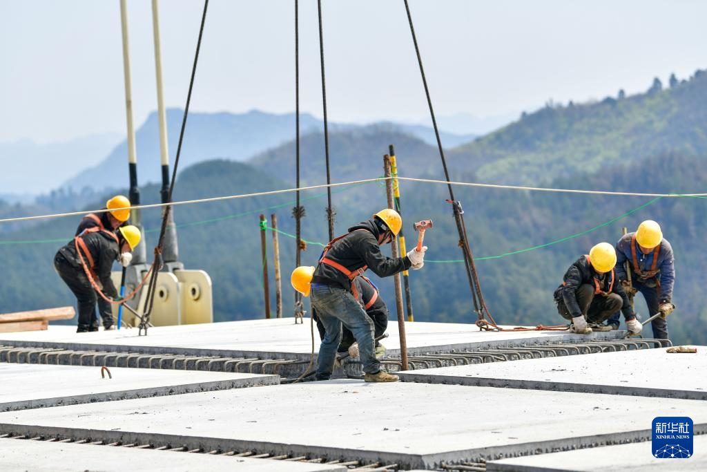 4月1日,工人在贵阳至平塘高速公路马场河特大桥上安装桥面板(无人机照片)。