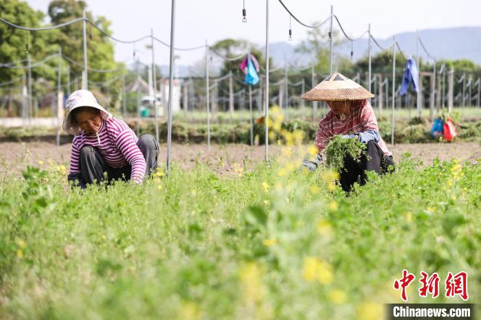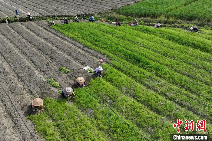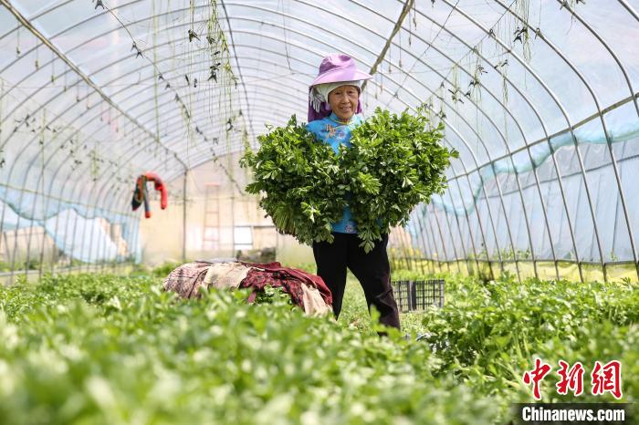 4月16日,贵州省黔南布依族苗族自治州龙里县湾滩河镇,工人在芹菜基地转运采摘的芹菜。连日来,当地天气晴好,民众抢抓农时开展农事活动,田间地头一派繁忙景象。中新社记者瞿宏伦 摄