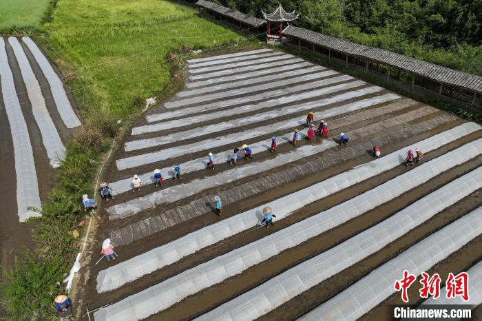 4月16日,贵州省黔南布依族苗族自治州龙里县湾滩河镇,工人在育秧基地劳作。连日来,当地天气晴好,民众抢抓农时开展农事活动,田间地头一派繁忙景象。(无人机照片)中新社记者瞿宏伦 摄