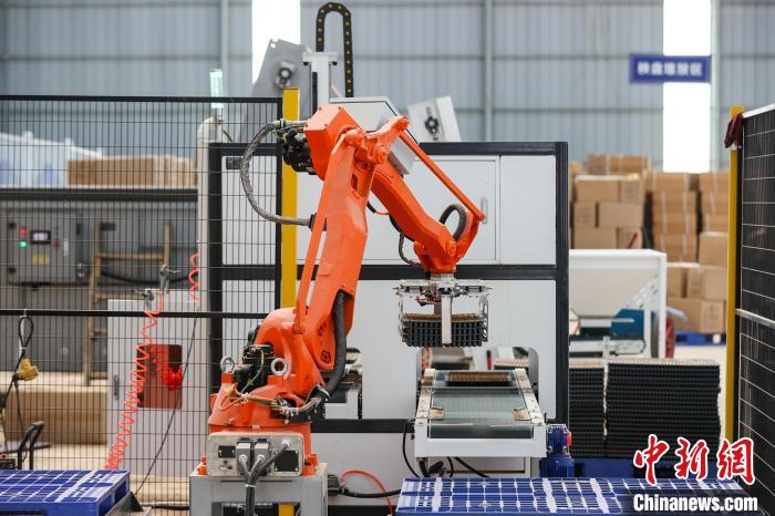 4月16日,贵州省黔南布依族苗族自治州龙里县湾滩河镇,自动化育秧设备在转运秧苗盘。据悉,该套设备每小时能完成600盘育秧任务,效率可提高3倍以上。中新社记者瞿宏伦 摄