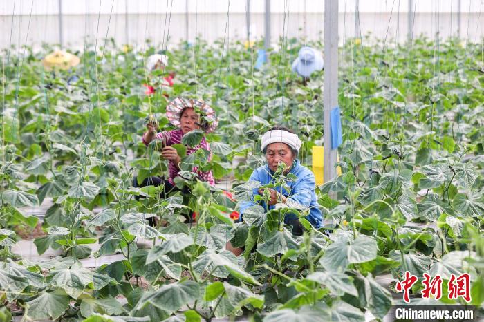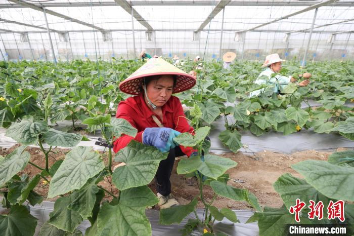 4月16日,贵州省黔南布依族苗族自治州龙里县湾滩河镇,工人在黄瓜基地挂藤。连日来,当地天气晴好,民众抢抓农时开展农事活动,田间地头一派繁忙景象。中新社记者瞿宏伦 摄