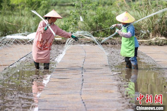 4月16日,贵州省黔南布依族苗族自治州龙里县湾滩河镇,工人在育秧基地搭建棚架。连日来,当地天气晴好,民众抢抓农时开展农事活动,田间地头一派繁忙景象。中新社记者瞿宏伦 摄