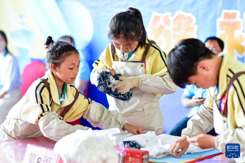 4月27日,学生在贵州省龙里县中等职业学校赛场进行缝补比赛。