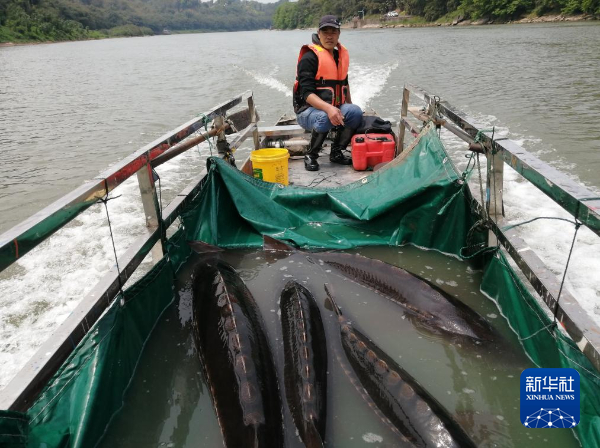 4月5日,中国科学院水生生物研究所研究人员在贵州赤水市复兴镇大鱼坝水域投放的长江鲟亲鱼。新华社发