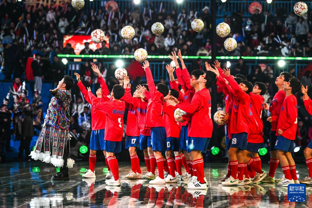 2月3日,人们在2026贵州“村晚”现场展示“姑妈”篮球。
