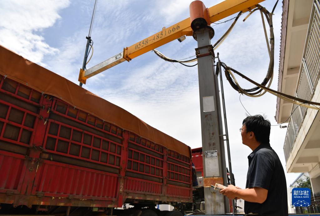 7月4日,在河南省邓州市国裕金丰种植专业合作社,一辆运粮货车在过磅。