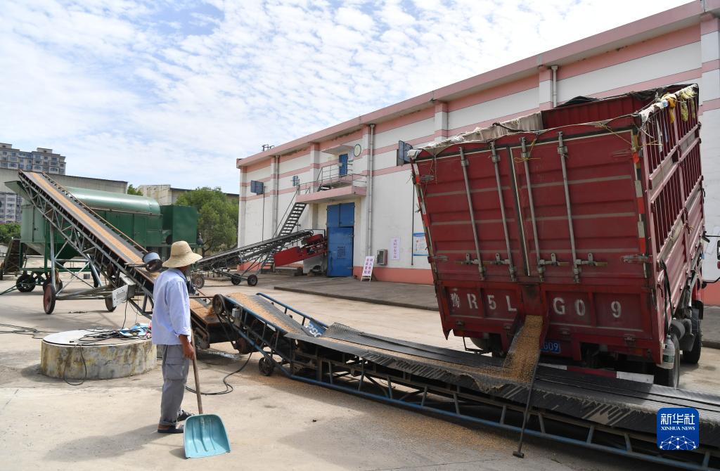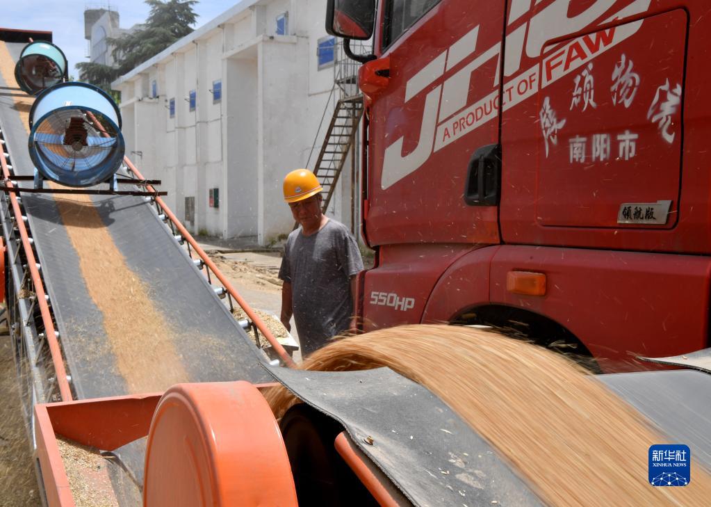7月4日,河南省邓州市国裕金丰种植专业合作社的工作人员在卸粮。