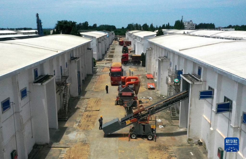7月4日,河南邓州国家粮食储备库的工作人员在进行卸粮入库作业(无人机照片)。