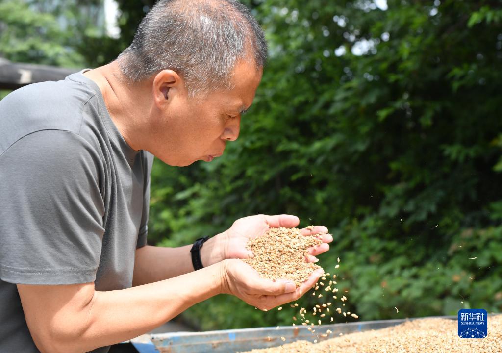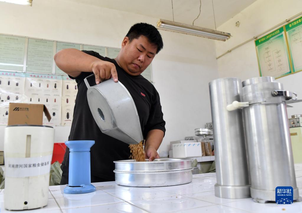 7月5日,河南唐河国家粮食储备库的工作人员在对小麦进行初步检查。