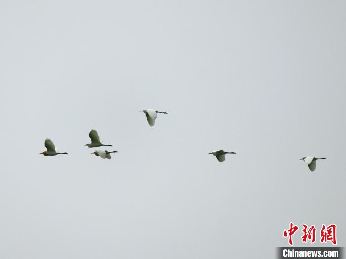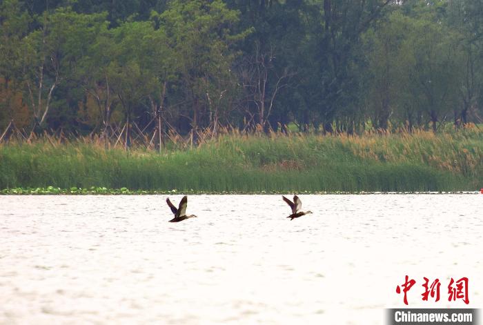 5月14日,河南郑州市中牟县雁鸣湖碧波浩渺,不时有水鸟飞过,呈现出一幅美丽生态画卷。图为飞鸟在湖上追逐、嬉戏。中新社记者刘鹏 摄