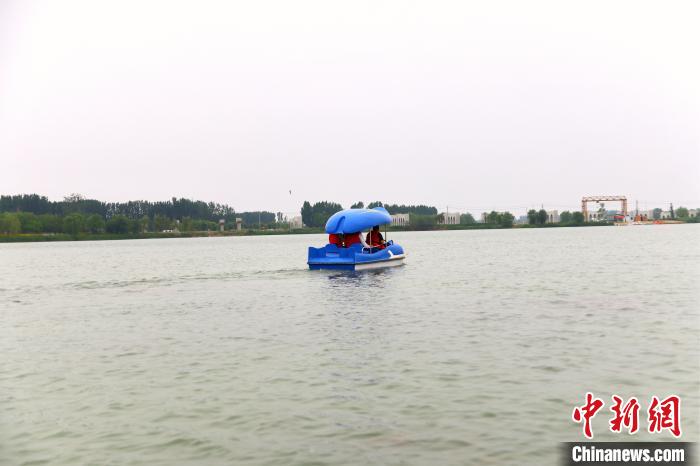 5月14日,河南郑州市中牟县雁鸣湖碧波浩渺,不时有水鸟飞过,呈现出一幅美丽生态画卷。图为游人泛舟湖上。中新社记者 刘鹏摄