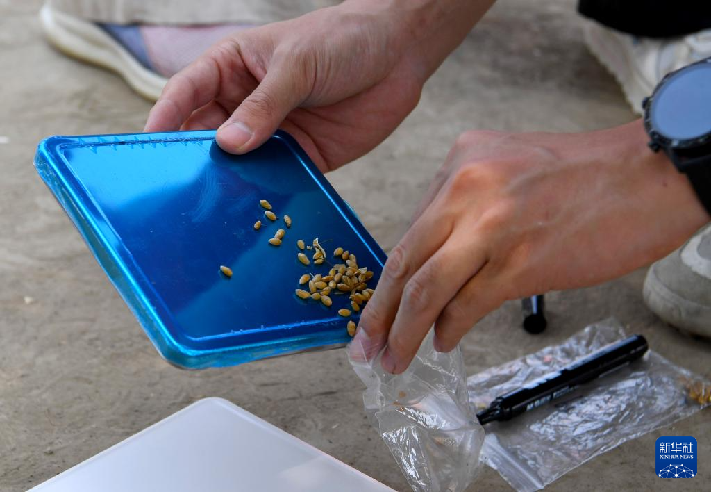 5月28日,在活动现场,工作人员在选定的采样区域捡拾掉落的麦粒。