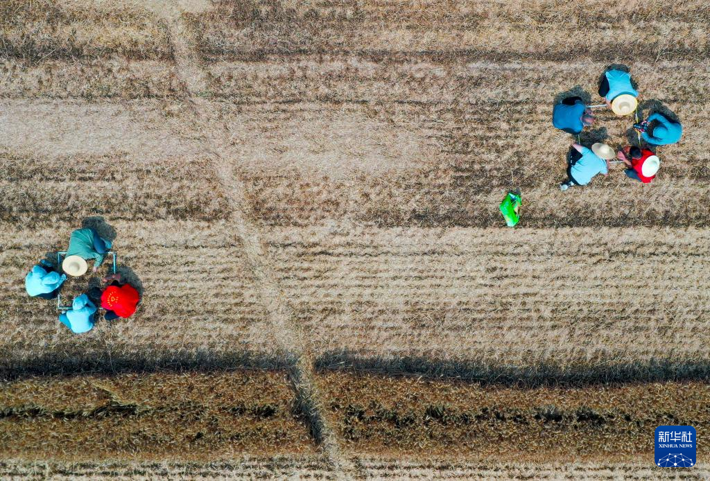 5月28日,在活动现场,工作人员在选定的采样区域捡拾掉落的麦粒(无人机照片)。