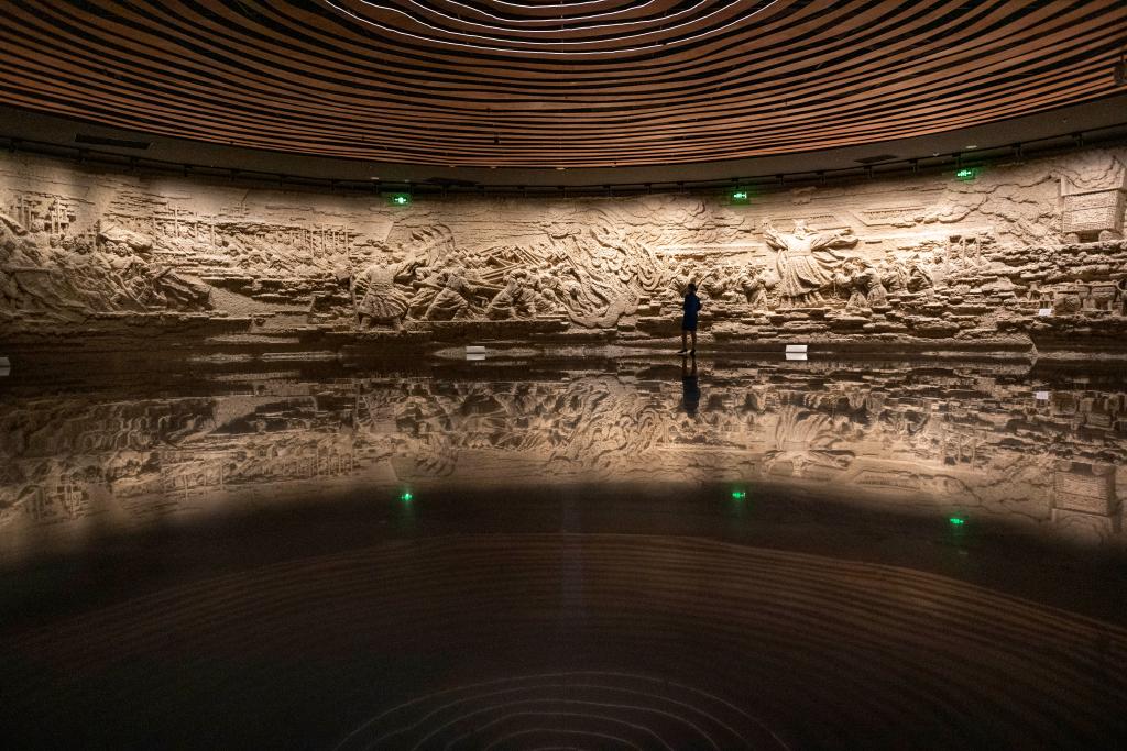 这是在郑州商都遗址博物院展厅内拍摄的环形浮雕墙。新华社记者徐嘉懿 摄