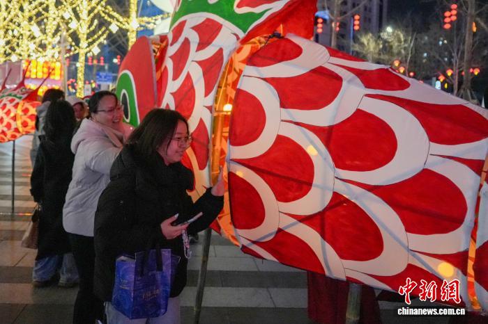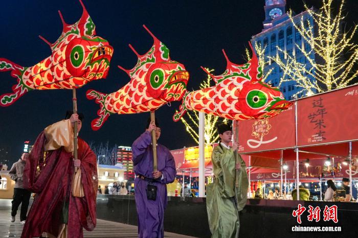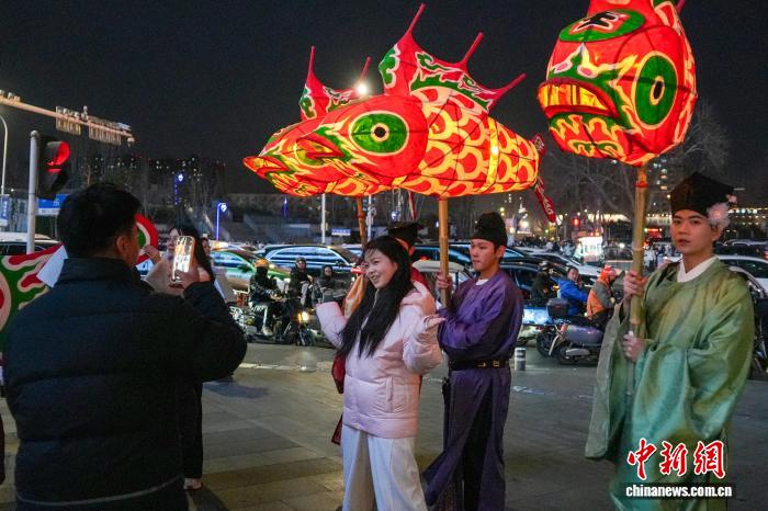 2月8日晚,河南郑州金水区花园路商圈一商场外举行鱼灯巡游表演,吸引众多市民和游客驻足观看、拍照打卡,巡游活动“解锁”商圈年味。图为鱼灯巡游现场。中新社记者范晓恒 摄