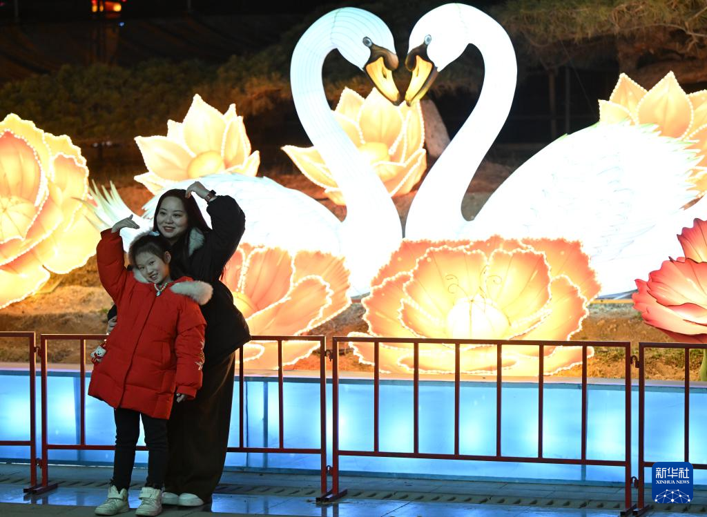 2月12日,游客在第九届陕州灯会现场赏灯拍照。