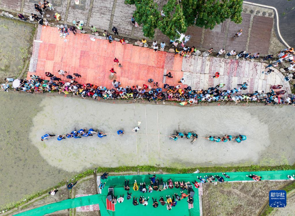 5月27日,秭归县九畹溪镇农民在水田里参加拔河比赛(无人机照片)。