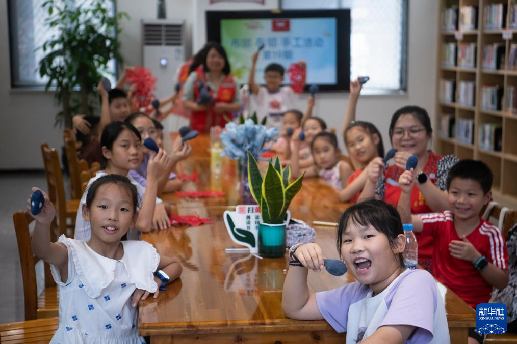 8月14日,在黄石宏维星都书房,小朋友们展示手工作品。