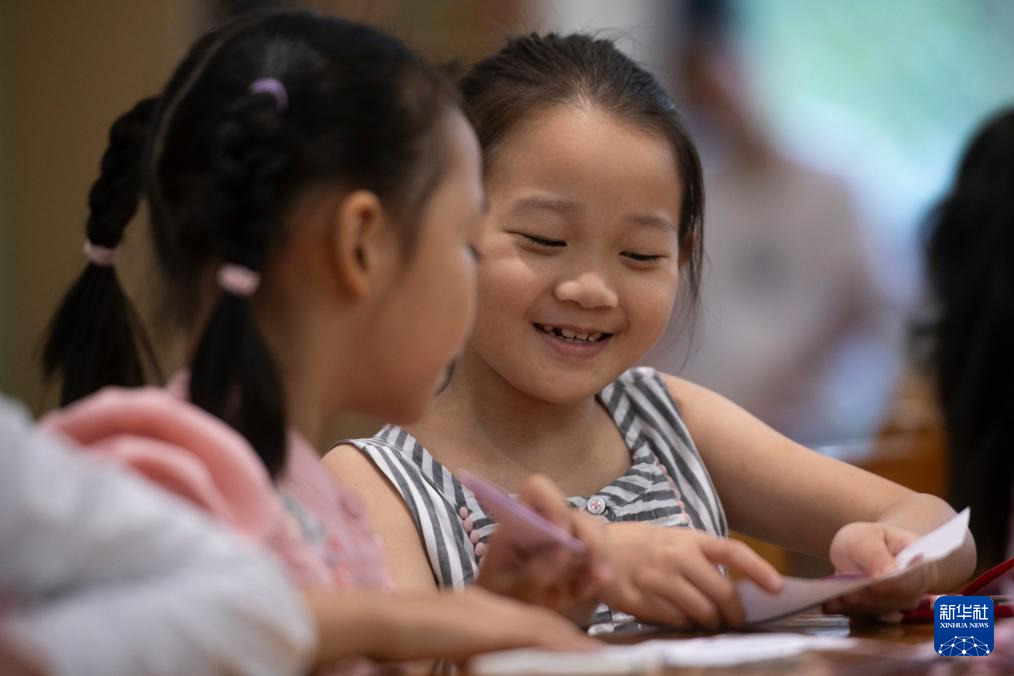 8月14日,在黄石宏维星都书房,小朋友们在学习剪纸。