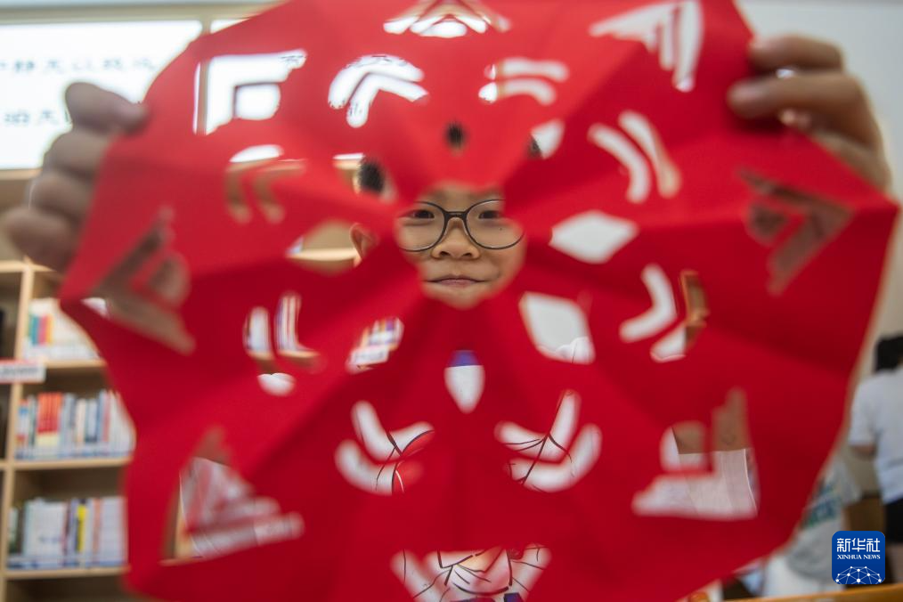 8月14日,在黄石宏维星都书房,小朋友在展示剪纸。
