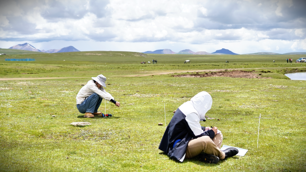 在查旦湿地,科考队员圈出一个1平方米的正方形草地样方,以样方为中心,向东西南北四个方向延伸,每隔2米设置一个监测点,再将土壤综合传感器插入监测点,监测仪上就会显示出土壤的实时温度和湿度。科考人员还用铲子取出一块含根系和植被的泥土,记录有机质层的厚度,进一步研究植被和土壤湿度、冻土退化之间的协同变化关系。