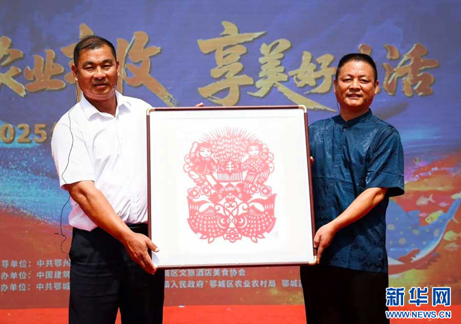 文化传承环节成为一大亮点。非遗传承人顾德将精心创作的“鱼庆丰年”雕花剪纸赠予峒山村,作品中双鱼戏莲与丰收麦穗相映成趣。“这不仅是一幅作品,更是对武昌鱼文化的深情致敬。”峒山村党总支书记陈又胜接过这份寓意深远的礼物时说。这一仪式展现了鄂城区对武昌鱼文化、长港农垦文化和乡愁文化的深度挖掘与传承。